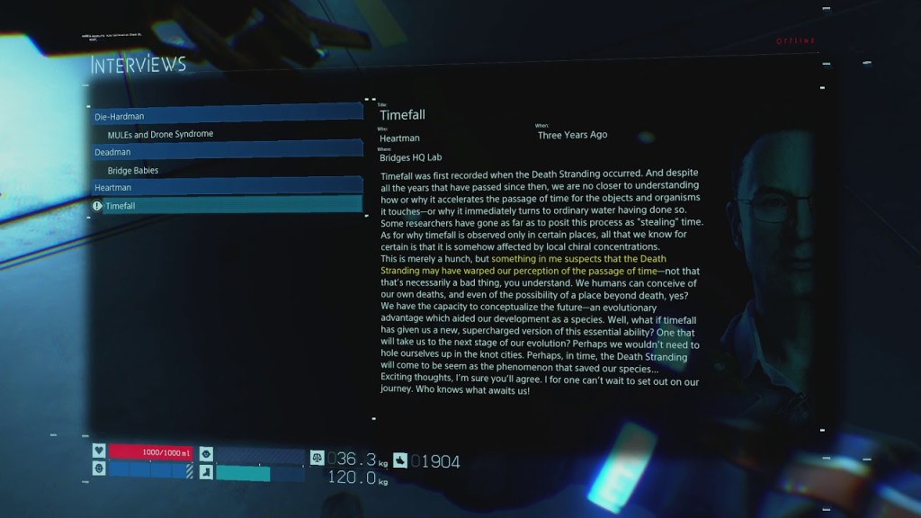 This was especially notable within the ‘interview’ segment, an extensive list of accounts from individuals who’re of various professions and backgrounds, past and present, that included details on the history, technology, backstory and politics of Death Stranding. With the many detailed explanations provided, it stood itself apart from games that simply pull from tropes, common conventions and pop-culture references to bait the consumers.