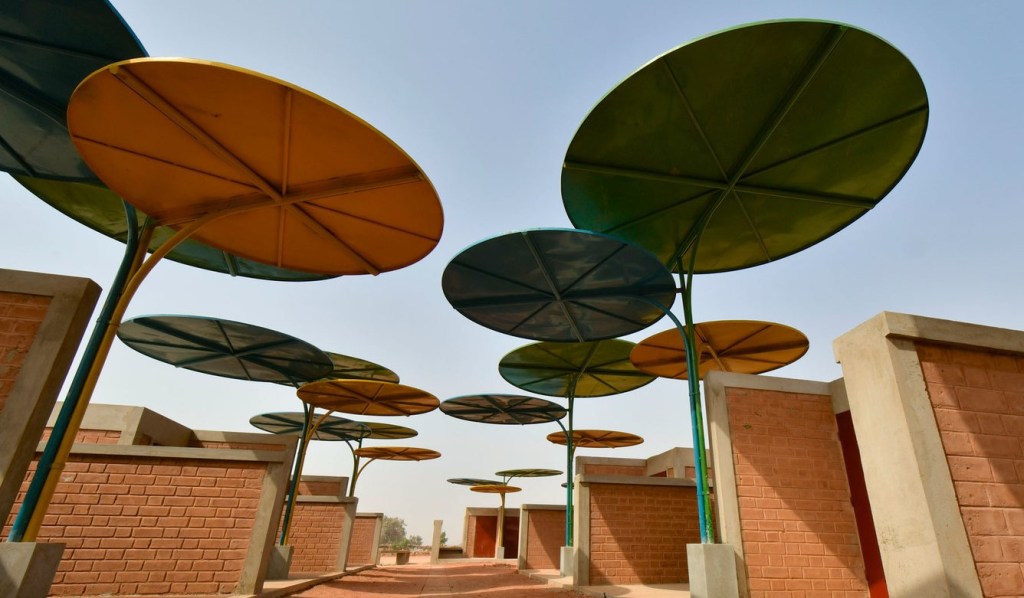 One such example is the ‘canopy disks’ deployed in her development of the Regional Market in Dandaji, Niger. They are a spectacle & a staple point to the region’s identity now. The tech is made of recycled metal produced into poles with disks on top, providing thermal & solar protection to vending spaces beneath the disks.