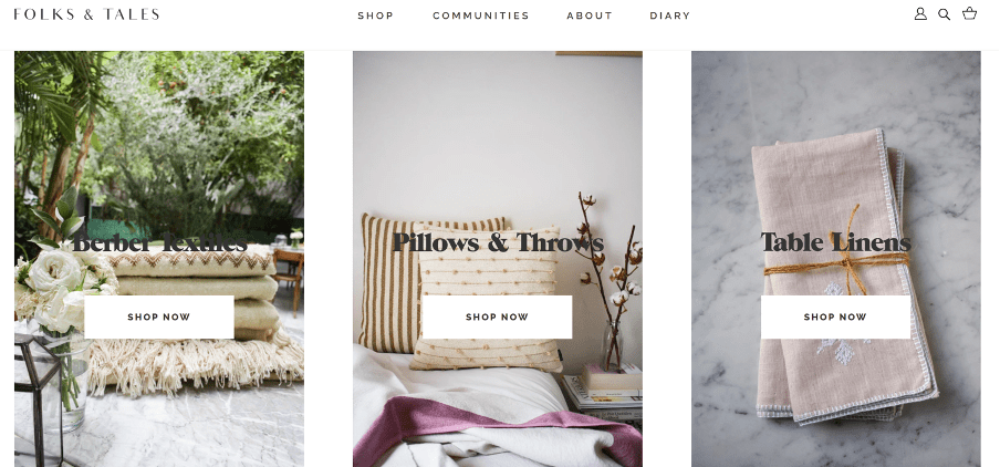 Further appealing to the international consumer’s eye is the Diary page on the website, hosting journal-style blogs from the founder, who proudly instils a theme within them of her mission to empower Berber women. The blogs shed light on stories of positive change her company has been part of and the sad stories that inspired her. Meaningful content like this on the website offers positive reaffirmation for those shopping with Folks & Tales, knowing they support an ethical operation that creates their products.