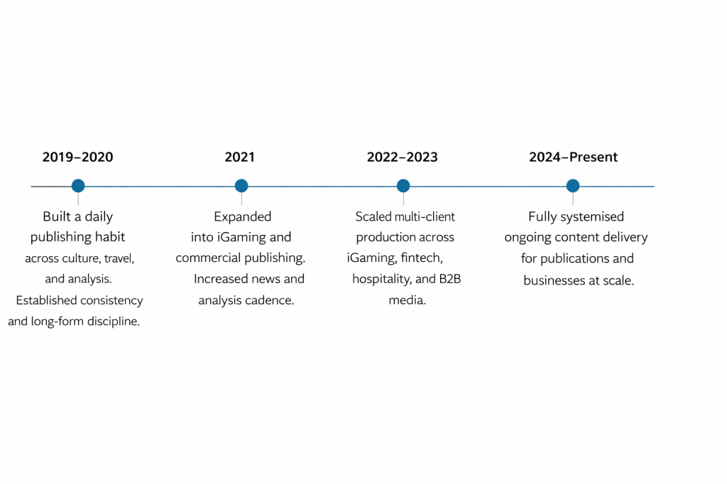 This is a high-level view of how my output evolved into a repeatable delivery system, built for consistent publishing, multi-format production, and ongoing client partnerships.